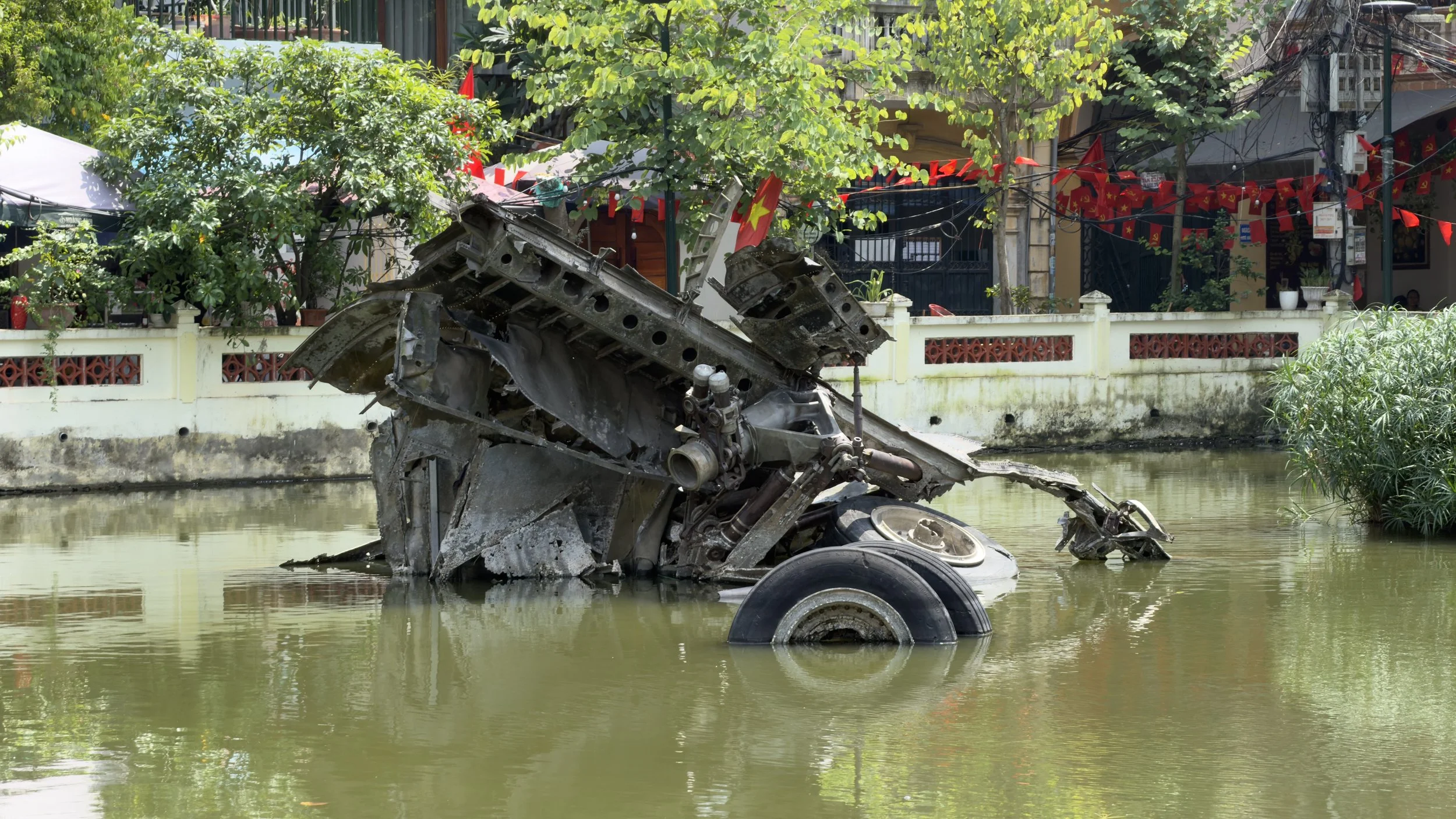 I wasn’t sure Annie was entirely convinced, but she trusted me enough not to protest. Two bikes were ordered, and as luck would have it, Annie’s driver arrived first. On went her helmet, and off she rode into the traffic while I waved, silently praying she’d end up at the right location. Eventually my driver arrived, and my own short yet exhilarating ride began, crossing over the famous train street while shoulder to shoulder with other riders and grabs alike. Our destination was a quiet little lake containing the rusting remains of a crashed U.S. Air Force B-52 bomber. The sight alone stopped me in my tracks as I got off the bike and nearly forgot to pay the man. There it was, twisted metal still rising out of the water, half-submerged, unpolished, unmoved. This wasn’t behind glass, nor sanitised. Just there, existing quietly in the middle of daily life.